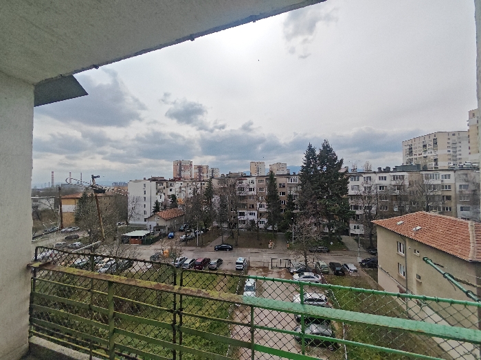 This image presents an expansive urban vista, viewed from a residential balcony in Sofia, Bulgaria, under an overcast sky