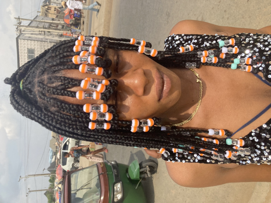 The image, captured in Ura Nta Umuarandu, Nigeria, displays a close-up frontal view of an individual from the upper chest upwards, against an urban background under bright daylight. The subject possesses dark skin and black braided hair, heavily adorned with numerous clear and orange horizontally striped cylindrical beads, interspersed with some white and light blue/teal beads. These beads are primarily visible on braids framing the forehead and sides of the face. A thin gold-colored chain necklace is worn, and the individual is dressed in a black sequined top. The subject's eyes are directed downwards. In the midground, to the left, a green and brown motorized tricycle (keke napep) is partially visible. Further back, a woman carrying bags walks past a white vehicle. The overall background depicts a busy street scene with multiple pedestrians, market stalls with colorful umbrellas, overhead power lines, and various buildings, including a multi-story structure with a grey facade and an older building with a more intricate design.