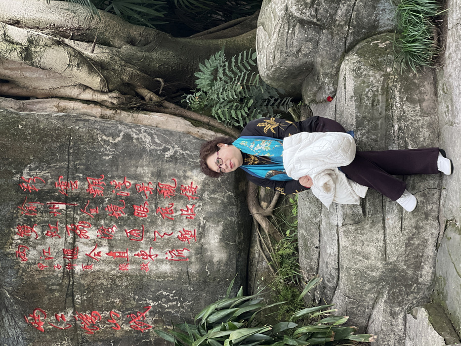 - "An Asian woman with glasses leans against a weathered stone marked with red Chinese characters" by FM-Cb0Vc2, licensed under CC BY 4.0