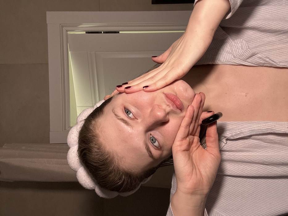 The image depicts a young adult female indoors in what appears to be a private residence or lodging in Oktyabr'skii, Russia. The subject has light skin, light brown hair secured back by a white, plush, scalloped headband, and blue eyes. She is wearing a light-colored, possibly striped, collared shirt or robe. Her hands are positioned on her face; the left hand supports her chin and jawline, while the right hand is gently pressing against her right cheek and jawline. Both hands exhibit dark red/maroon fingernail polish. A dark, possibly black, ring or object is visible on the index finger of her left hand. Her face has a reflective sheen, indicating the presence of a liquid or product, with small droplets visible near her chin and cheek. She is looking upwards and slightly to the right with a neutral expression. The background consists of a plain, light-colored wall. A white door frame is visible behind her, with the door slightly ajar. A translucent white object, possibly a shower curtain, is partially visible in the upper left corner. The lighting is soft and ambient.