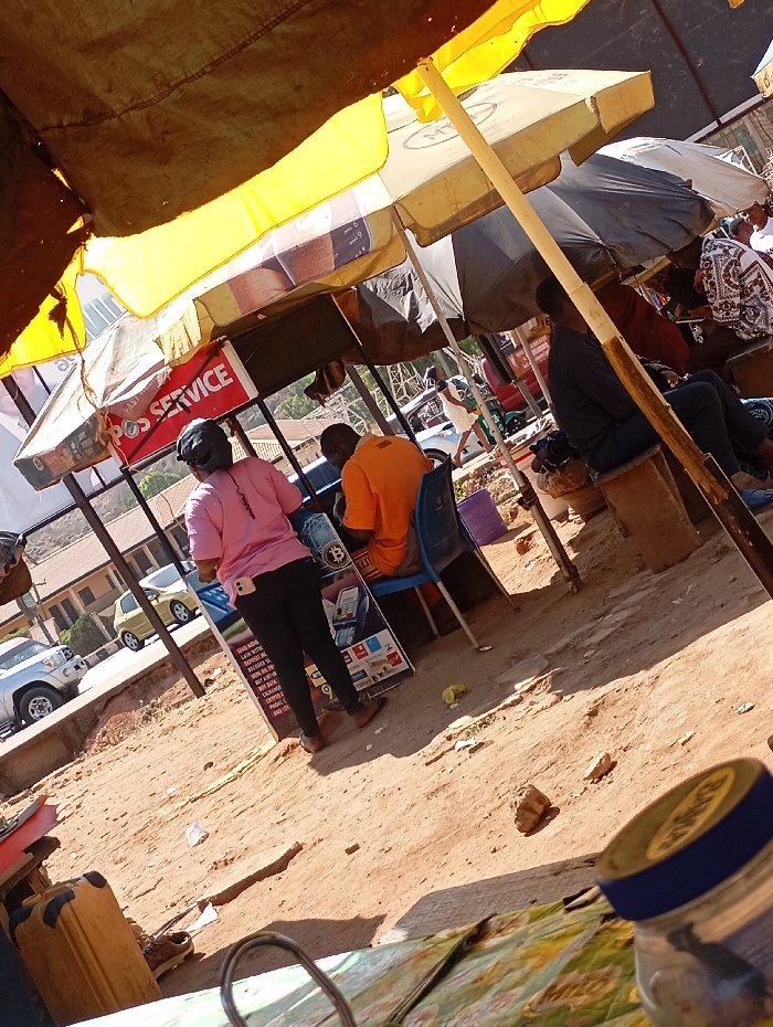 The image captures an outdoor commercial area in Jos, Nigeria, characterized by bright daylight and strong shadows