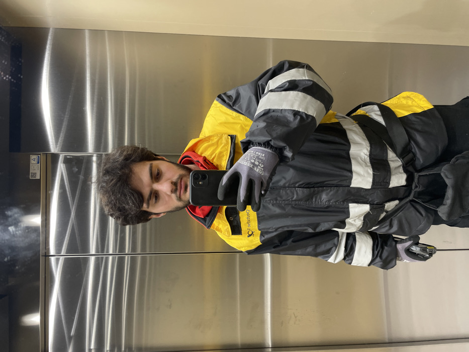 A young adult male, likely a Deutsche Post employee, is depicted in an elevator taking a mirror selfie. He has dark, wavy hair and a short beard, looking down at the black smartphone held in his gloved left hand. He wears a red hooded sweatshirt under a yellow and black high-visibility work jacket with reflective stripes on the arms and torso. The jacket displays the "Deutsche Post" logo on the left chest area, reversed due to the reflection. He wears grey and black work gloves. A black utility belt with a pouch and a small electronic device is visible around his waist. The elevator interior features brushed stainless steel doors with reflections behind him and a plain light brown or beige wall to his right. This scene occurs within an elevator in Nuremberg, Germany.