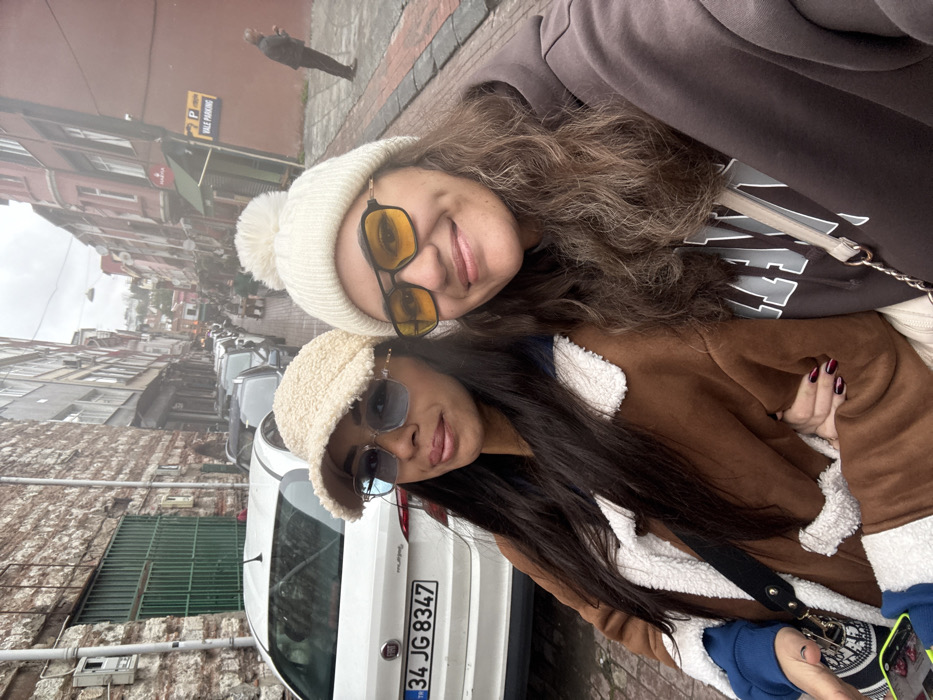 Two women are captured in a close-up selfie-style photograph on a narrow, sloped street in Istanbul, Turkey