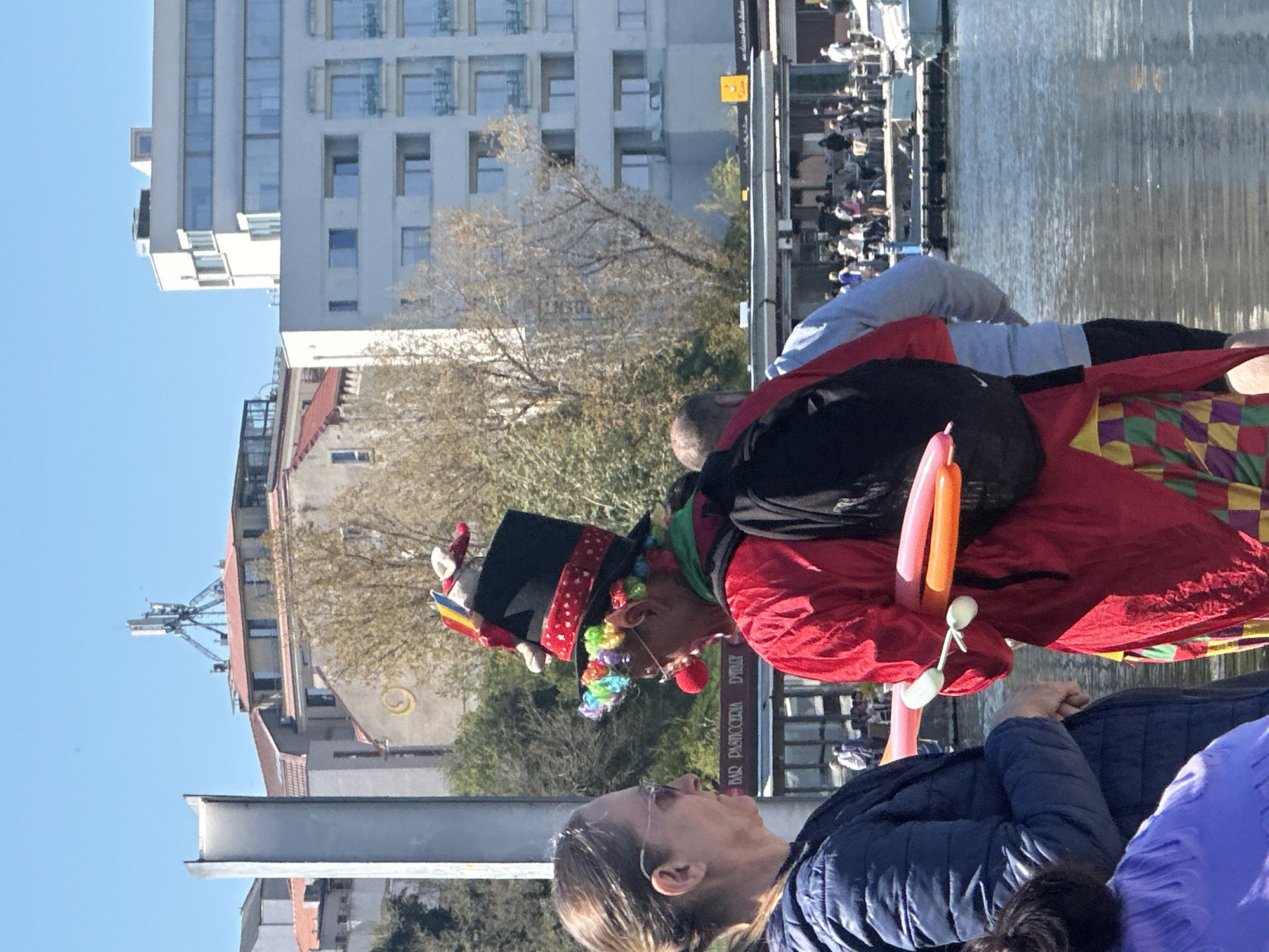 - "clown, wearing a tall black hat adorned with colorful decorations, a red suit with a backpack, and a clown nose, creating balloon animals near a canal or river" by FM-U3eL23, licensed under CC BY 4.0
