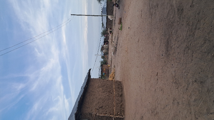 A dirt road runs alongside a mud-walled building with a dark roof. An electric pole stands tall in the distance, with wires stretching across the sky. Further down the road, other buildings are visible amidst a group of people and a white animal, possibly a goat. The sky is blue with wispy clouds, contrasting with the earth-toned landscape.