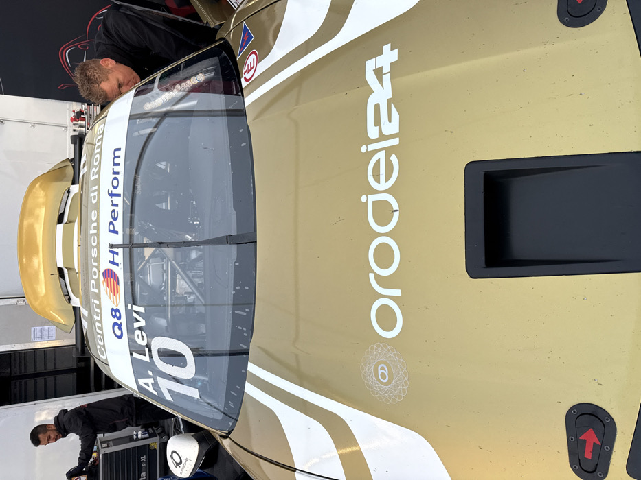 The image depicts a racing pit garage scene at Monza, Italy. A gold and white Porsche racing car, bearing the number 10 and driver name "A. Levi" on its windshield, occupies the foreground. The windshield also displays "Centri Porsche di Roma," "Q8 Hi Perform," and "Sabelt" branding. The car's hood features a prominent "orodei24" logo with a circular graphic and a dark rectangular intake vent. Two small red arrow decals are visible on either side of the hood. Two adult males are present. On the left, partially obscured, a man in a dark jacket is seen working near a black structure, appearing to handle equipment. On the right, a man with short blond hair, also in a dark jacket, leans over the car's front right side, intently inspecting the windshield or cockpit interior. A white racing helmet with a Porsche logo rests on the ground to the left of the vehicle. The background consists of white tent structures, indicative of a temporary service area. The car's gold paint exhibits minor scuffs and dirt consistent with racing conditions.