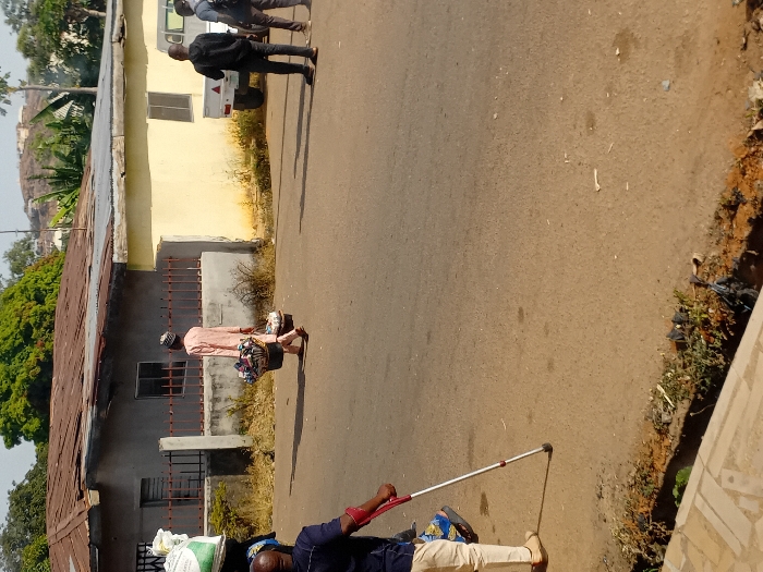 This image depicts a daytime street scene in Jos, Nigeria. In the foreground on the left, a person, partially visible, wearing a blue shirt and light trousers, walks away from the camera, using a single crutch with a red handle. A bag is carried on their back. The paved road, appearing worn, stretches into the mid-ground. An individual, dressed in a light-colored tunic and cap, walks from left to right across the road, carrying two dark, round baskets filled with various items suspended from a stick. Further right, two men stand beside a white pickup truck; one in a dark hoodie and dark trousers, the other in a blue shirt and light trousers with a backpack. The background features two single-story buildings with corrugated metal roofs; the left building is grey, and the right is yellow, both having windows and a low concrete fence with metal railings. Distant, sparsely vegetated hills are visible on the horizon. The immediate foreground shows an unpaved ditch bordering the road, containing litter and some plant growth.