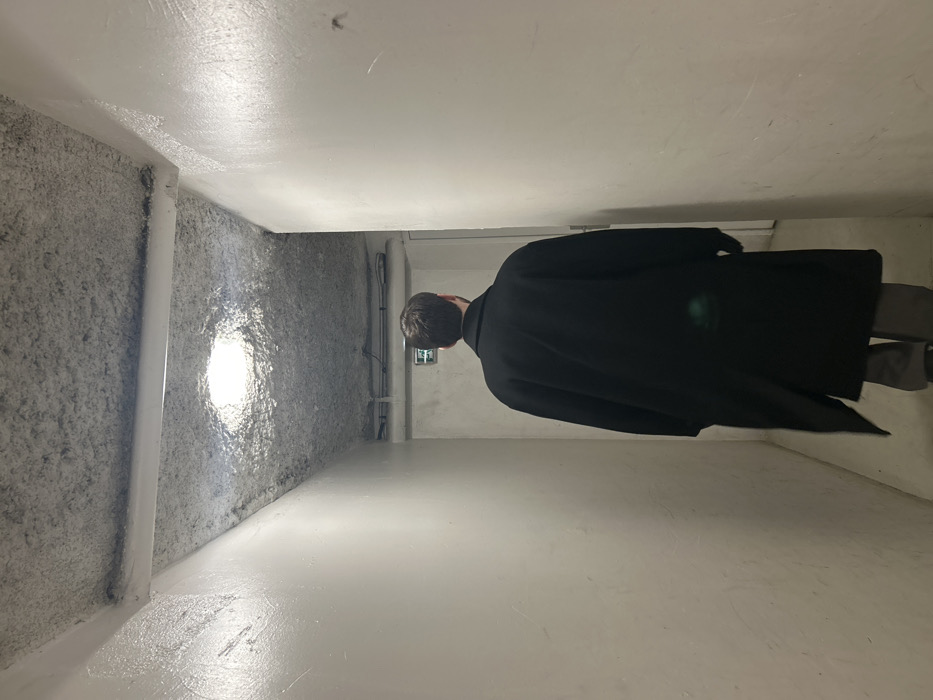 A person in a long black coat walks through a narrow, enclosed space. The walls on the left appear rough and textured, illuminated by a bright light source. The right wall and ceiling are smooth and painted white. The floor is also a light color. An exit sign is partially visible on the back wall above the person's head. The person's back is towards the viewer.