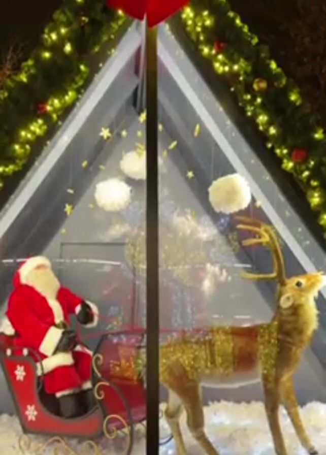 Christmas display featuring Santa in a sleigh and a reindeer inside a triangular structure. The structure is decorated with garland, lights, and a red bow. Fake snow covers the ground inside the display.