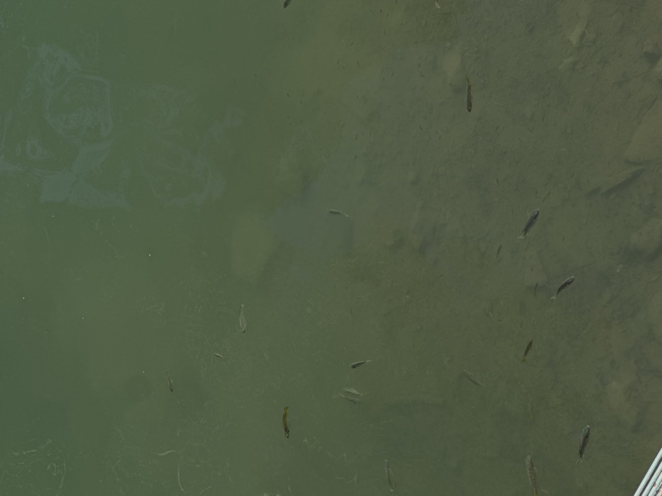 The image displays an overhead view of a body of murky green water, consistent with a freshwater lake or river, located within the Emek HaYarden Regional Council, Israel. The water's partial transparency reveals a bottom composed of light-colored sediment and darker, irregular rocky formations. Approximately two dozen small to medium-sized fish are visible swimming at varying depths. These fish are predominantly slender and silvery-grey in coloration; one fish in the lower-left quadrant exhibits a distinct yellow caudal fin. A large, indistinct, dark mass, potentially a submerged object or a larger aquatic creature, is faintly discernible beneath the surface in the upper-mid section of the frame. The water surface shows minor ripples and some subtle, lighter circular patterns. A small portion of a light-colored, angular structure, possibly a dock or boat edge, is visible at the extreme lower-left corner. No human individuals, additional objects, or land features are visible above the waterline.