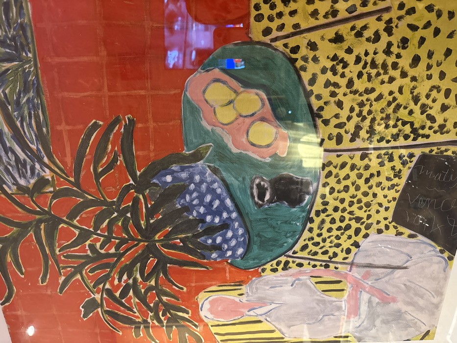 This image is a photograph of a painting by Henri Matisse, titled "Interior with a Young Woman (The Etruscan Vase)," created in 1940. The artwork is currently housed at the Musée National d'Art Moderne, Centre Pompidou, Paris, France. The painting depicts a stylized interior scene. On the left, a faceless figure with a light pink head and hands, wearing a light grey dress, is seated on a yellow chair with vertical black stripes. A round, teal-green table occupies the central foreground. On the table, a blue vase with white polka dots holds a large, dark green leafy plant. To the right of the vase, a small black jug is positioned. Further right, a pink oval platter contains four yellow, ovoid objects. The background wall is a solid red with a faint grid pattern. The floor or rug is yellow with irregular black spots, resembling a leopard print. The photograph displays reflections on the artwork's surface, including distinct blue and red lights on the right side, indicating the painting is under glass in a gallery setting. A partial reflection of text, possibly a label, is visible in the lower left corner.
