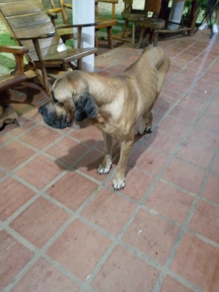 - "A tan-colored dog with black ears and muzzle stands on a tiled patio" by FM-Q5qB73, licensed under CC BY 4.0