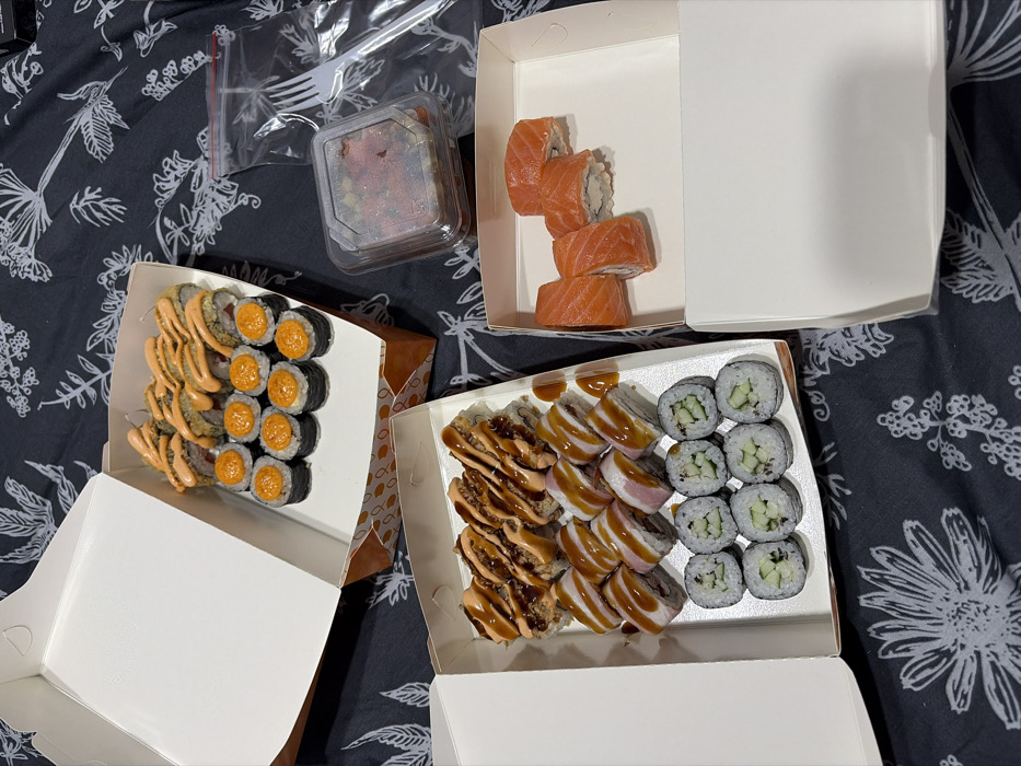 Three white cardboard boxes containing sushi sit on a patterned surface