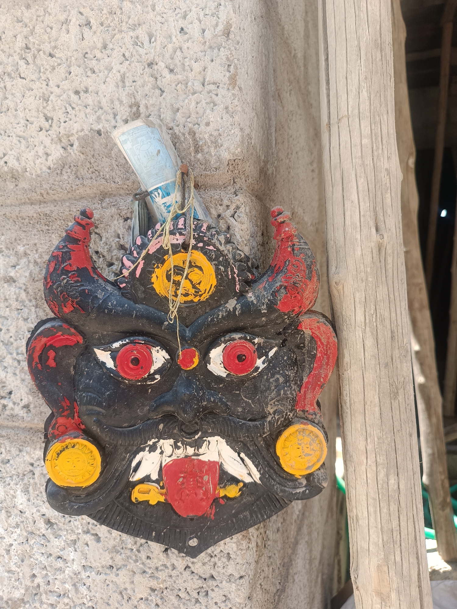 A weathered, multi-colored, horned mask is affixed to a textured, light-grey wall in Pedda Kammavaripalli, India