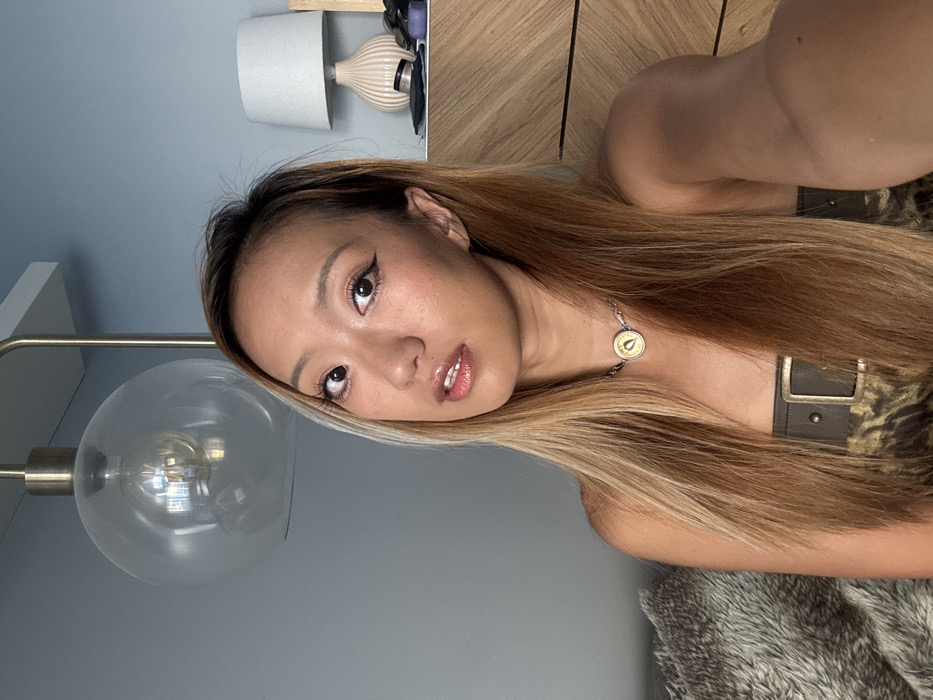 A young East Asian woman is captured in a head-and-shoulders selfie, looking directly into the camera with a neutral expression. Her long, straight hair is two-toned, transitioning from dark roots to light brown and blonde ends, parted on the side. She wears winged eyeliner and a glossy lip. A silver-colored chain necklace with a circular gold-toned pendant, featuring a subtle emblem resembling a horseshoe, rests on her neck. Her attire includes a strapless top with a mottled camouflage or animal print pattern, and a visible dark brown belt with a square buckle. The background depicts an indoor residential setting with a light blue-grey wall. To the upper left, a modern brass-toned wall sconce with a clear spherical glass shade and exposed filament bulb is visible. To the upper right, a cream-colored, ridged table lamp with a white shade sits on a light wooden surface. This wooden furniture, possibly a dresser or cabinet, features a chevron or zig-zag grain pattern. A small white shelf on the wooden furniture holds a white cylindrical container, a black makeup sponge, and a small purple item. A textured, grey faux-fur throw blanket is partially visible in the lower left, indicating a seating area. The location in the city of Paris, France, is not discernible from the visual information provided.