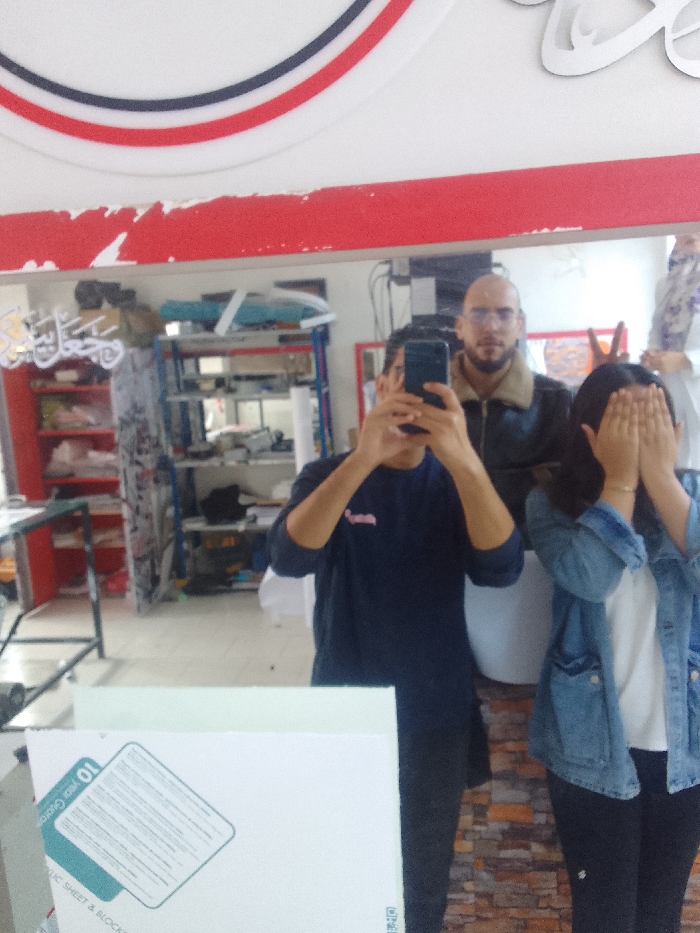 The image is a selfie taken in a mirror, depicting three individuals within what appears to be a commercial workshop or signage production facility