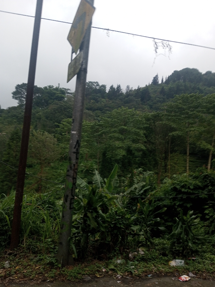 The image displays a vegetated roadside scene in Jabalpur, India, under an overcast sky. In the left foreground, a dark, slender vertical pole stands, partially obscured by a grey metal utility pole positioned immediately to its right. This grey pole features two weathered, faded yellow signs, partially obscured and unreadable, mounted near its top. Green and black graffiti is present on the lower section of the grey pole. Dense green foliage, comprising tall grasses and broad-leafed plants, grows abundantly from the ground around the bases of both poles and extends into the midground. The immediate foreground shows a dark, paved surface with scattered litter, including white plastic bags and red wrappers, visible on the pavement and among the plants. The background is dominated by a heavily forested hill, densely covered with green trees. A single thin wire, possibly a utility line, with entangled dried plant material, stretches horizontally across the upper mid-section of the frame. No individuals or animals are visible.
