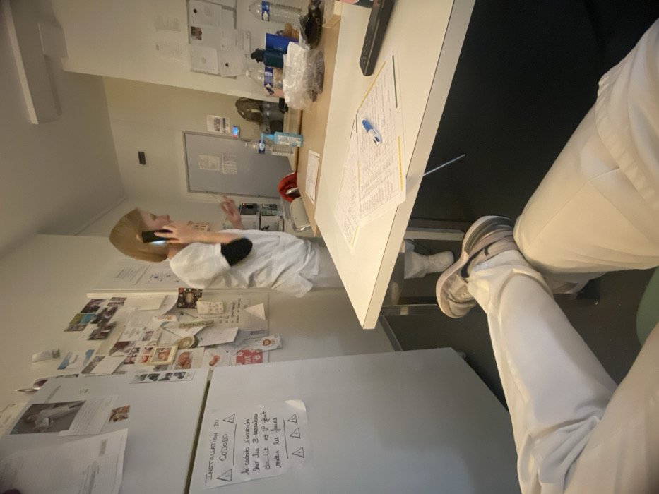 An office setting shows a woman on the phone standing near a refrigerator covered in photos and notes. A sign on the refrigerator reads "INSTALLATION DU CODODO" with instructions. The foreground contains a desk with papers and office supplies. An individual wearing white pants and sneakers has their legs crossed. The overall impression is of a busy workspace.