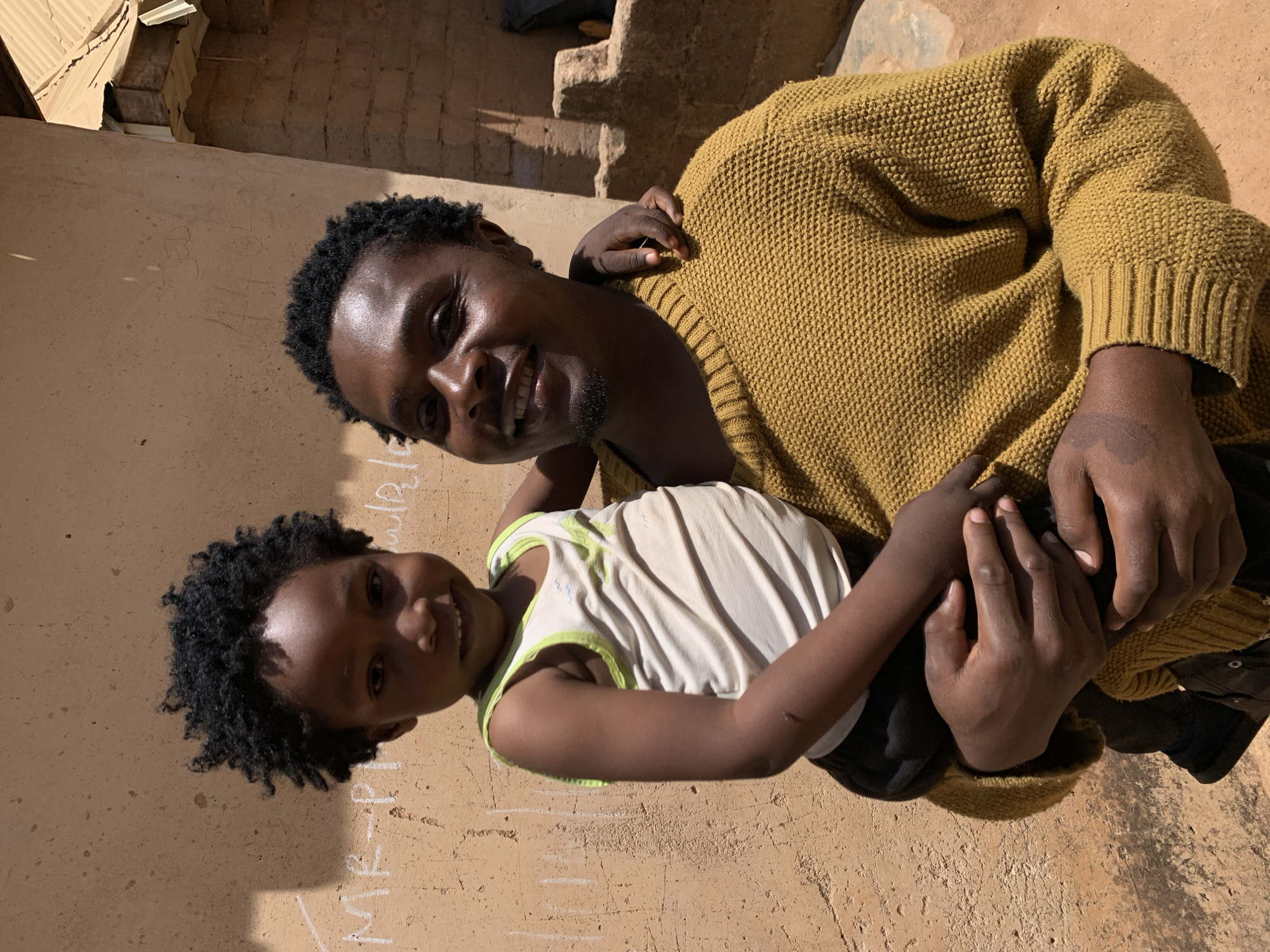 The image captures an adult male holding a young child outdoors in the city of Jos, Nigeria. The adult male, with dark skin, short dark curly hair, and light facial stubble, wears a mustard yellow knitted sweater. He smiles directly at the camera while holding the child with both hands; his left hand supports the child's back/waist area, and his right hand is near the child's left leg. The child, appearing to be between three and six years old, has dark skin and short, curly dark hair. They wear a light-colored sleeveless top with neon green trim and dark trousers, also smiling towards the camera. The child's right arm rests over the adult male's left shoulder. A small linear scar is visible on the child's left forearm. The background features a textured, light brown wall with white chalk markings, including partial text "MR-P" and faint numbers "44" and "95." To the right, a weathered building constructed with exposed mud bricks and a corrugated metal roof is partially visible. The scene is brightly lit by natural sunlight.