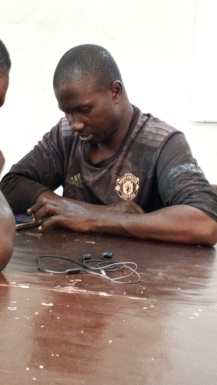 An adult male is seated indoors at a dark brown table in Dakata, Nigeria