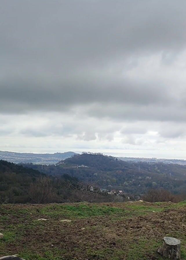 n overcast outdoor scene from a slightly elevated position. In the foreground, there's a grassy area with patches of exposed soil and a few logs or tree stumps. A rough-hewn wooden bench or table is visible in the lower left corner. The background features a panoramic view of a landscape composed of rolling hills covered in trees, with a city visible in the distance along the coast. The sky is heavily clouded, contributing to the overall gray and somewhat gloomy atmosphere. There is some indistinct audio of a child’s voice.