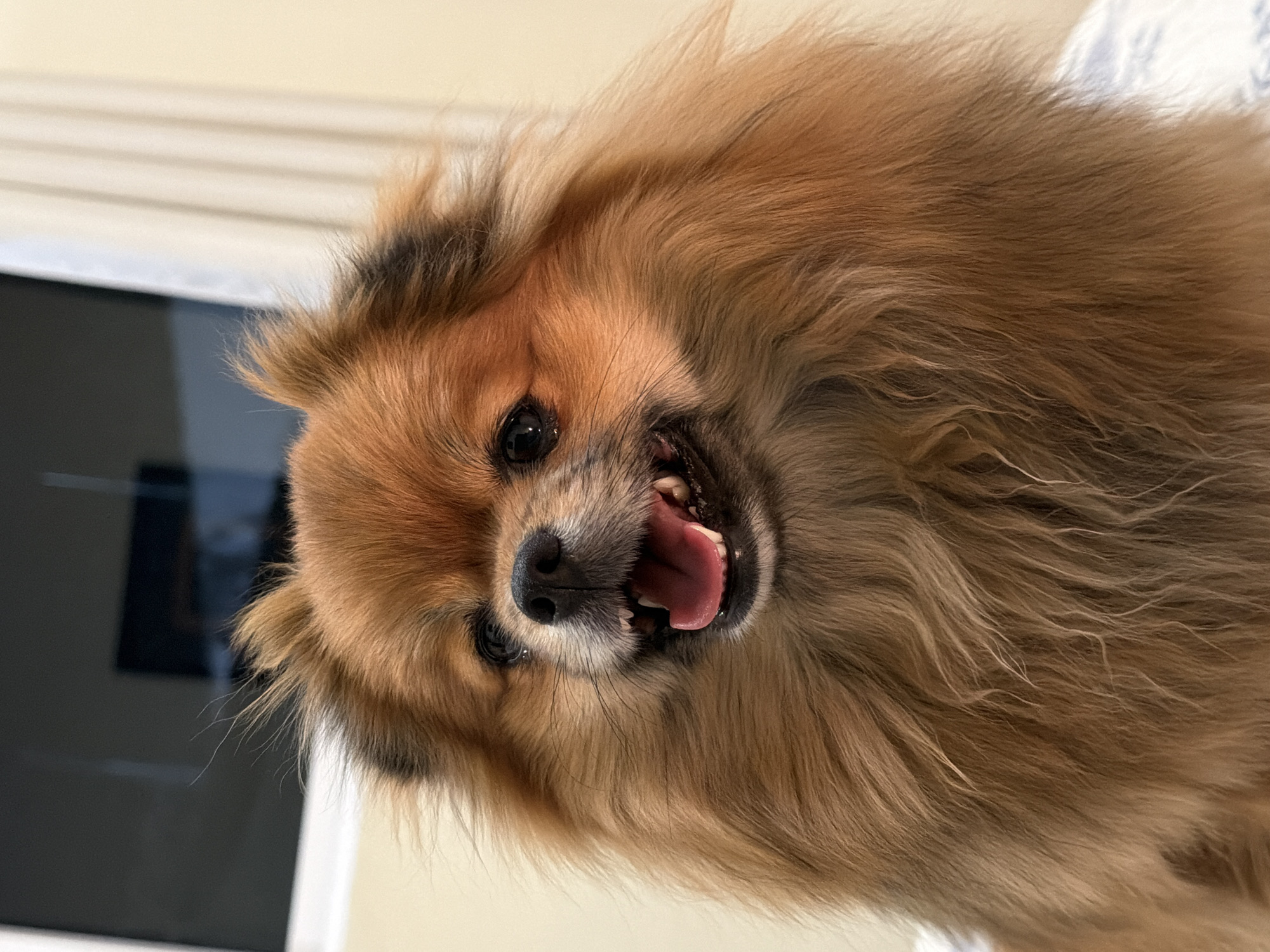 A close-up of a brown Pomeranian dog is presented. The dog's mouth is open, revealing its tongue and teeth. A television is visible to the left. The location is unknown and cannot be assumed as the city of Cuautla, Mexico.