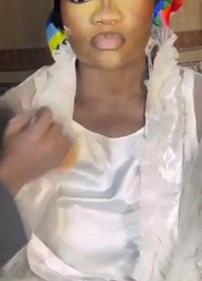 Here is a brief description of the video: A woman is getting her makeup done. Another person is applying lip color to her lips. The person doing the makeup is dressed in a black jacket. The woman getting the makeup done is sitting in a green chair, wearing a white dress with a ruffled sheer layer. She has a black headband on, and colorful hair rollers are visible behind it. A wad of money is held up momentarily in front of her. The background features a patterned curtain.