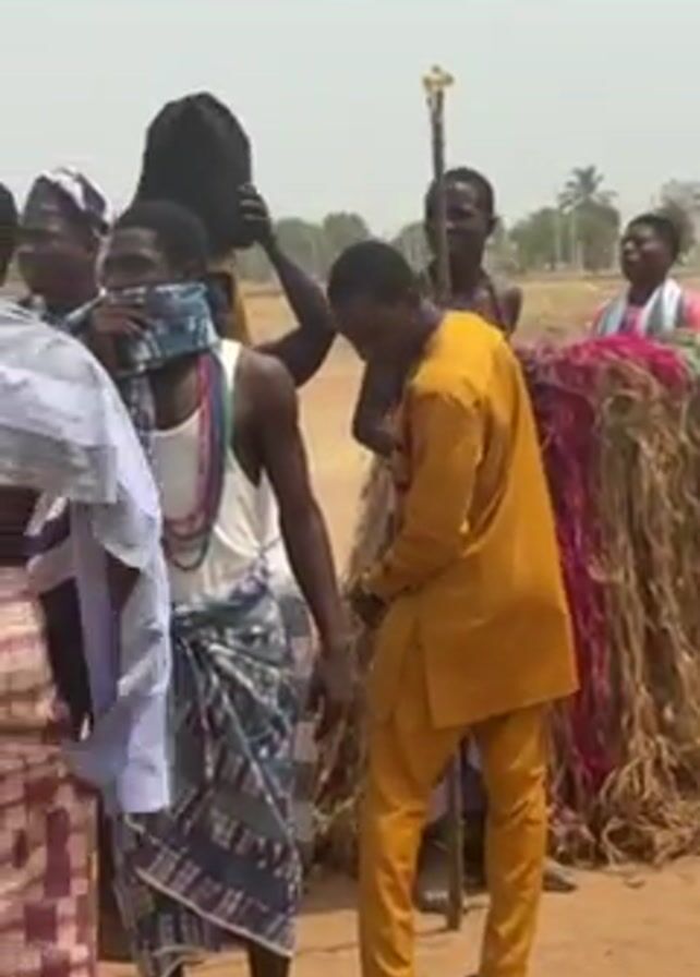 group of men in an open, dusty field. Several are dressed in what appear to be traditional or ceremonial attire, including colorful wraps, beads, and a large, possibly ritualistic, costume made of rope-like material. One man carries a staff topped with a golden ornament. The attire varies, with some men in simple clothes and others in more elaborate garments. The men interact, gesturing and speaking, and one man plays a drum. In the background, there are buildings and trees, suggesting a town or city nearby. The lighting is bright, and the video appears to be shot outdoors on a sunny day.