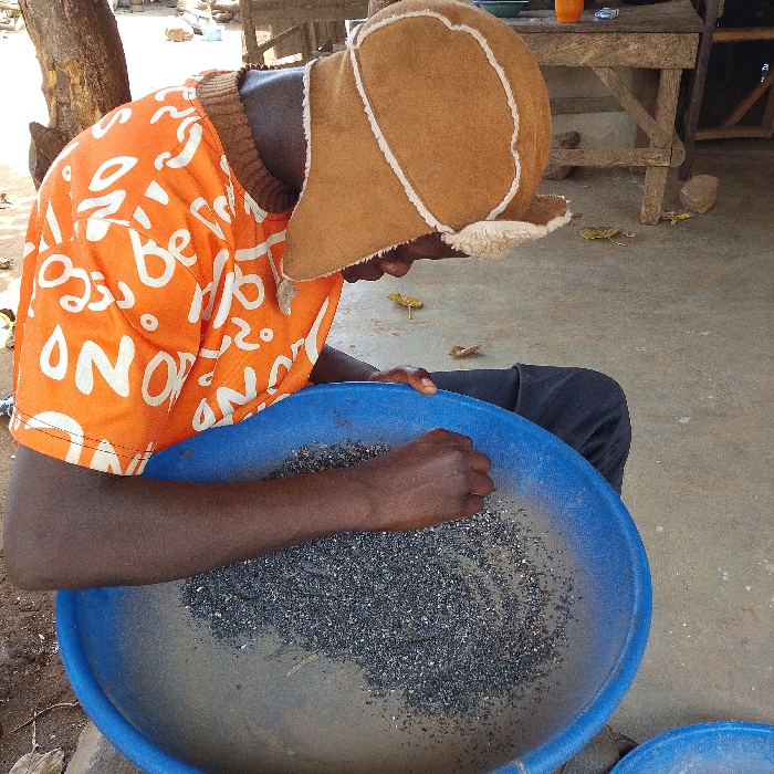 A person wearing an orange shirt with white letters and a brown hat is sitting and sorting through a blue bowl filled with what appears to be small, dark stones or seeds. The individual's head is bent over the bowl, suggesting close attention to the task. A wooden structure and tree are visible in the background. Another blue bowl is visible in the corner. The setting appears to be outdoors.