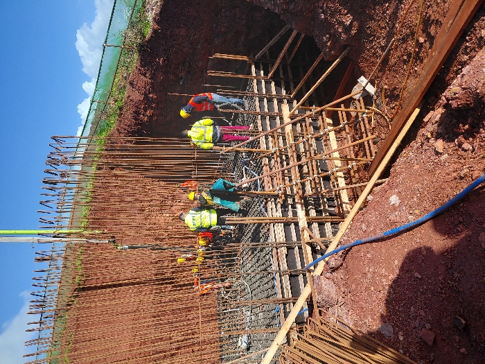 Construction workers wearing safety gear are building a rebar structure within a deep earth excavation. Reinforcing steel bars form a grid-like framework, and wooden beams provide support. A concrete pump's hose is visible, suggesting concrete will be poured. The site features red soil. A green safety fence borders the top of the excavation. The sky is partly cloudy.