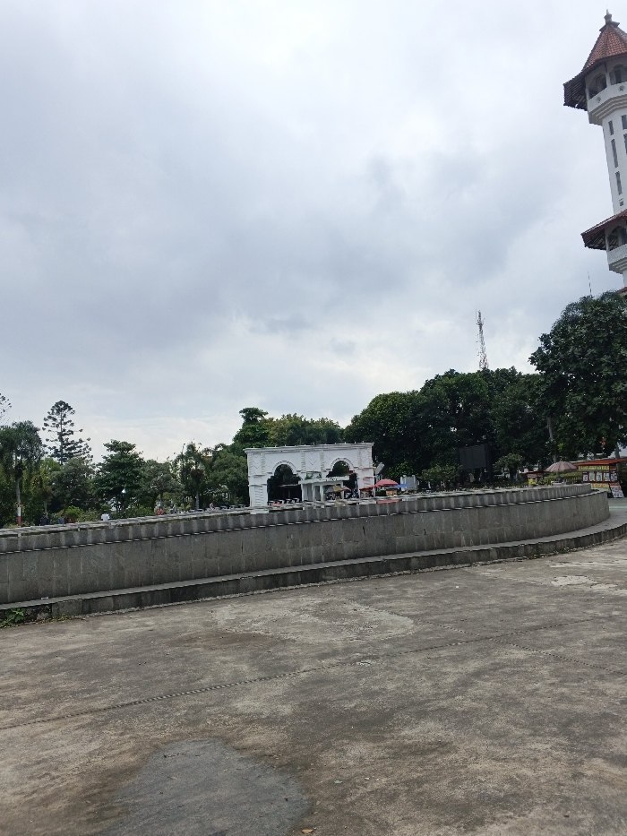This image depicts the entrance area of Dam Sen Cultural Park in Ho Chi Minh City, Vietnam, under an overcast sky. The foreground consists of a wide, irregular concrete expanse, showing various stains and wear. A curved, multi-tiered, gray stone wall or barrier separates the foreground from the mid-ground. Behind this wall, a large, ornate white archway, typical of an entrance, is prominently centered. Beyond the archway and extending across the mid-ground, a densely treed park area is visible, containing several indistinct structures, possibly kiosks or small vendor stalls with red awnings or roofs. A tall, slender cellular tower rises above the treeline slightly to the left of the archway. On the far right, a section of a multi-story white tower with a distinctive red-tiled, conical roof structure is visible, partially obscured by trees. A few distant, indistinct human figures are present within the park area, but no specific actions or interactions are discernible.