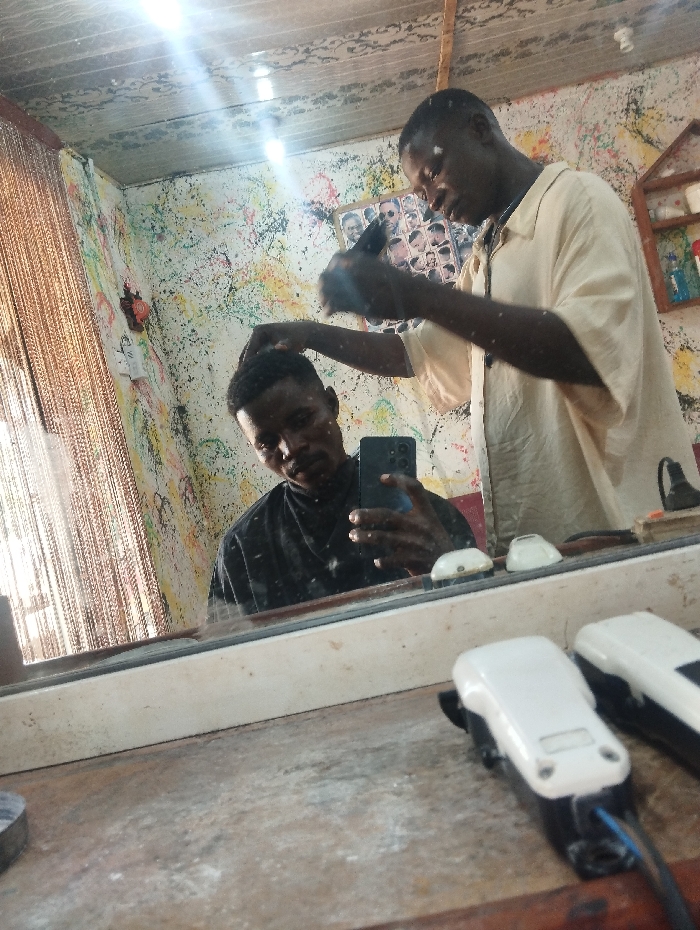 A mirror-reflected image depicts an active barbershop scene located in Unguwan Rimi, Nigeria
