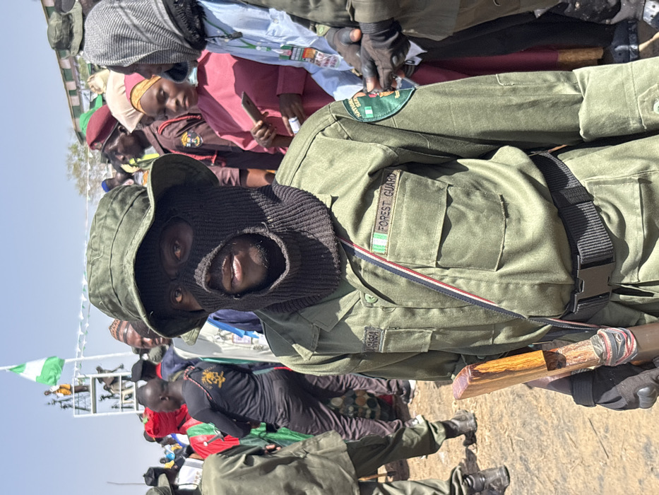 An outdoor scene in Galadima, Nigeria, depicts a crowded public gathering under a clear, bright sky. In the foreground, a male individual stands facing the camera, wearing an olive-green long-sleeved uniform shirt with two chest pockets. He wears a black balaclava covering his face from the eyes down and an olive-green boonie hat. A name tag above his right chest pocket reads "MARGAA". Above his left chest pocket, a patch displays "FOREST GUARD" with a small Nigerian flag insignia. On his left shoulder, a patch features the Nigerian flag, the text "NATIONAL SERVICE", and an emblem. A red, white, and blue striped strap crosses his chest from left to right. He holds a rifle with a reddish-brown wooden stock in his gloved right hand, the barrel angled slightly downwards and partially obscured. The ground consists of bare earth or sand. In the midground and background, a diverse crowd of people are standing and observing. Notable individuals include a man in a black long-sleeved shirt with a yellow emblem and dark trousers, and another individual wearing a maroon beret. To the right of the main subject, a woman in a pink long-sleeved top and a yellow headscarf holds a light-colored smartphone. Next to her, an individual in a light blue top and grey hooded covering has dark-skinned hands clasped in front. In the far background, a tall metal scaffolding structure supports several people, with a Nigerian flag (green, white, green) flying at its apex.