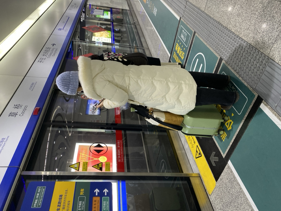 A person wearing a white hooded coat, blue beanie, and black pants is standing on a green platform in front of a subway car. The person is looking at their phone. The subway door has signs with Chinese characters and symbols. There's a green suitcase near the person's feet. The platform has markings for train car positioning. The subway signage indicates information about the train line and car arrangements.