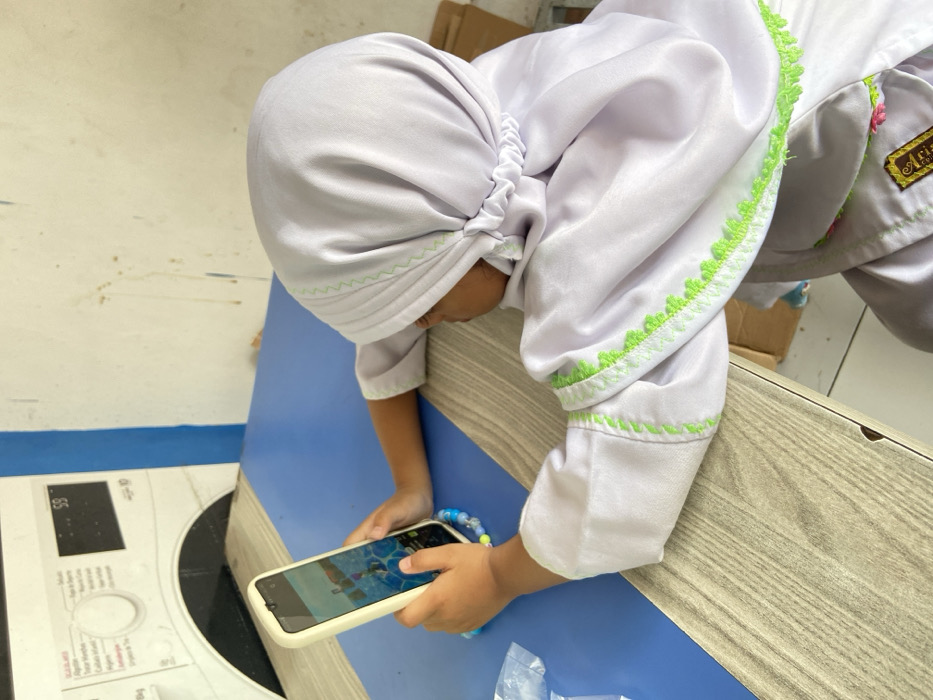A child wearing a white hijab and white uniform with green trim is engrossed in a smartphone. The phone displays a colorful graphic. The child is sitting at a table with a blue and light wood-grained surface. A white washing machine is visible in the background to the left. A beaded bracelet adorns the child's wrist. The lighting suggests an indoor setting with natural light.