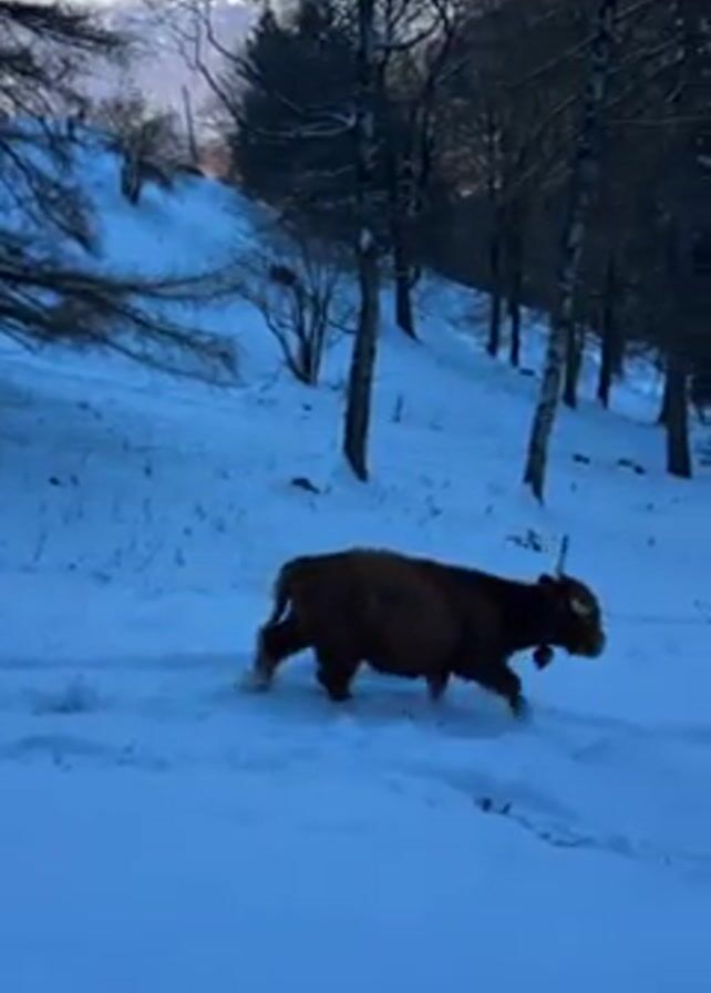 - "A brown, horned cow walks across a snowy field in a forest" by FM-fbqYv1, licensed under CC BY 4.0