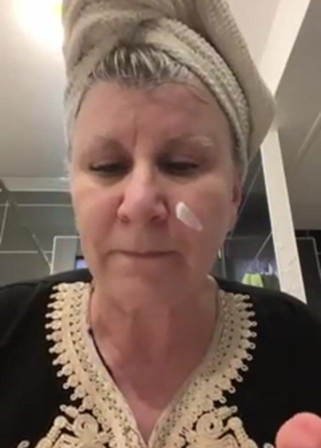 A woman with a towel wrapped around her head is applying white cream to her face. She is wearing a black robe with gold embroidery around the collar. The background appears to be a bathroom with white and gray tiled walls. She dots the cream on her forehead, cheek, and chin before rubbing it in.