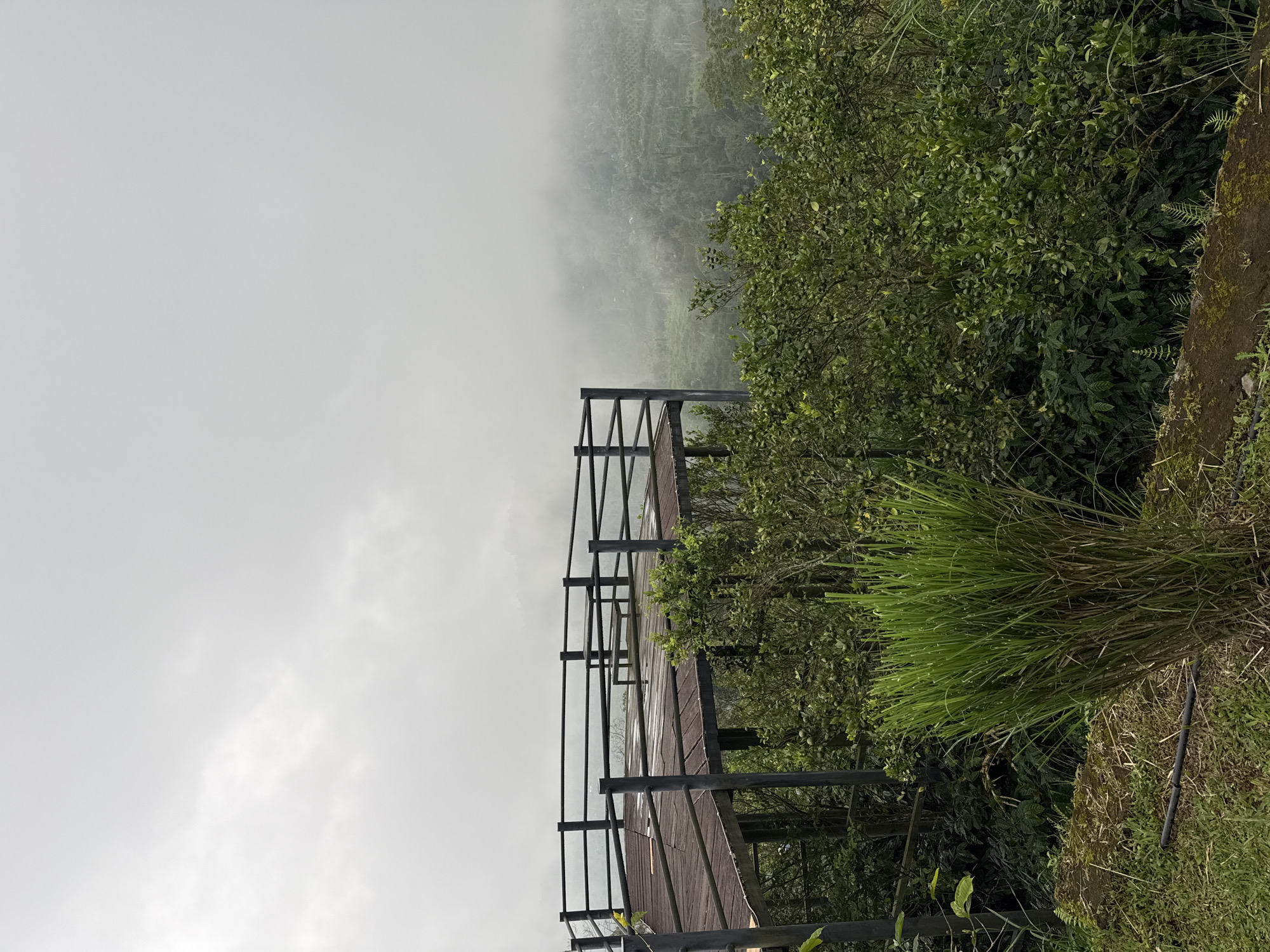 From a slightly elevated vantage point in Petang, Indonesia, a view of a partly-overcast landscape with dense foliage is observed. A wooden deck with black metal railings extends into the scene. Dense green vegetation flanks the deck, while further in the distance, a misty vista veils the landscape. A power line or black cable lies on the foreground, next to a shrub.