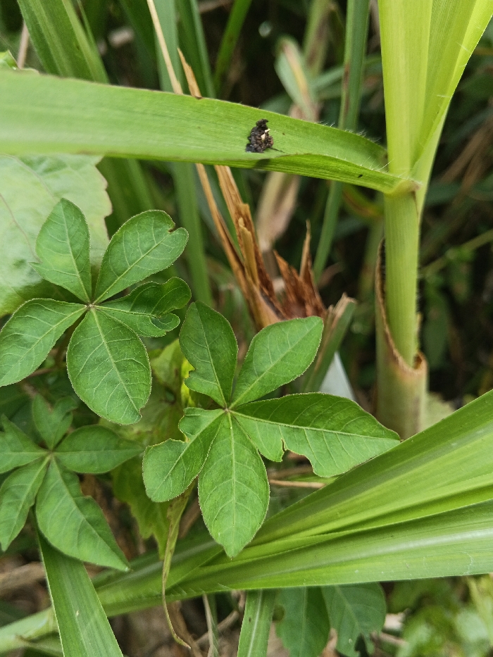 The scene depicts a close-up of dense vegetation in Buyantashi, Zambia. The primary subjects are various green plants and a small insect. In the upper left quadrant, a broad, bright green leaf or blade of grass features a dark-bodied insect or insect cluster, possibly a pupa or egg mass, with some white or lighter coloration visible on its dorsal surface, resting on the leaf's upper surface. Below this, prominent in the midground, are several leaves belonging to a different plant, characterized by a palmate structure with five discernible leaflets per stem, exhibiting a vibrant green hue. Some of these leaves show minor, irregular notching or holes along their edges, indicative of insect herbivory. To the right, a thick, upright green stem or stalk is visible, possibly belonging to a grass or cane-like plant. The background consists of blurred green foliage and hints of dried, brown plant matter, suggesting a natural, overgrown environment. No human presence or artificial objects are observed.