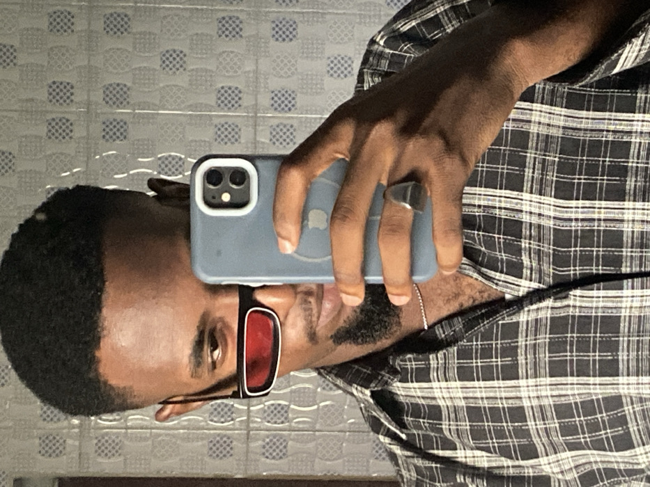 An adult male with dark skin, short dark hair, and a short beard is captured in a mirror selfie indoors in Lagos, Nigeria