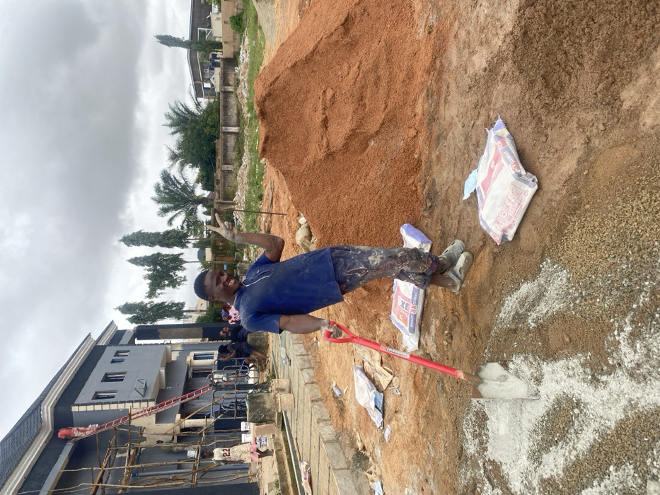 The image depicts a construction site in Jos, Nigeria, under an overcast sky