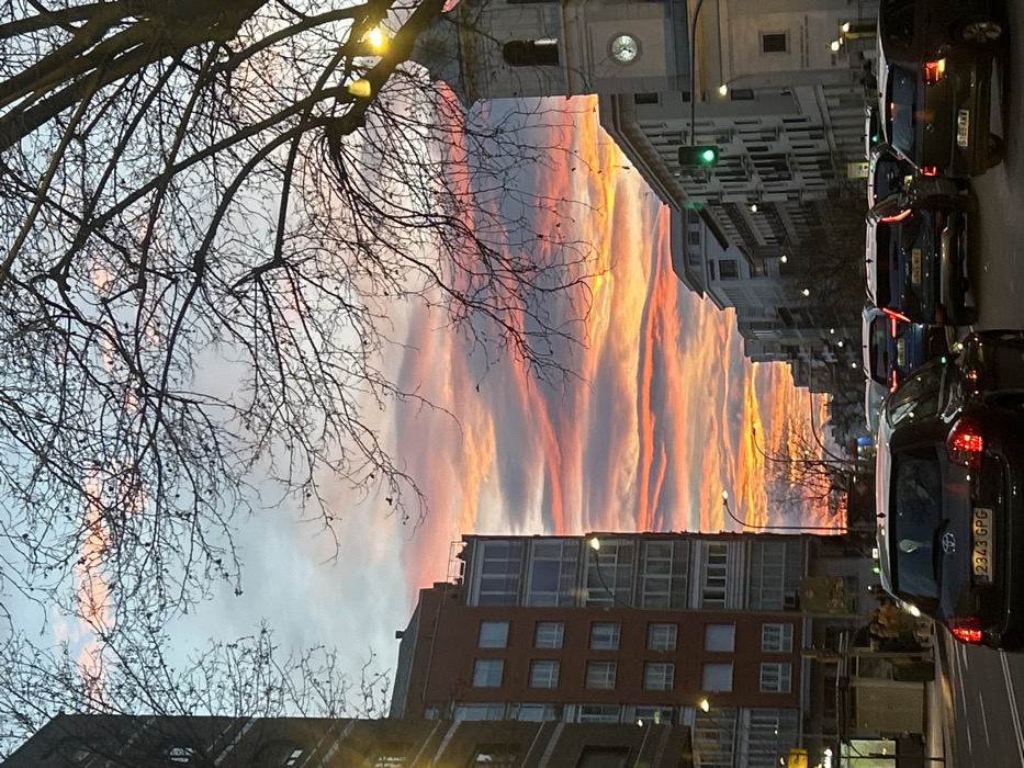 An urban landscape features tall buildings lining a street, with a vibrant sunset sky visible between them. Cars are parked along the roadside. Leafless tree branches frame the upper portion of the scene, contrasting with the architectural elements and the colorful sky. A traffic light glows green. The sky displays shades of orange, pink, and grey, creating a striking visual effect.