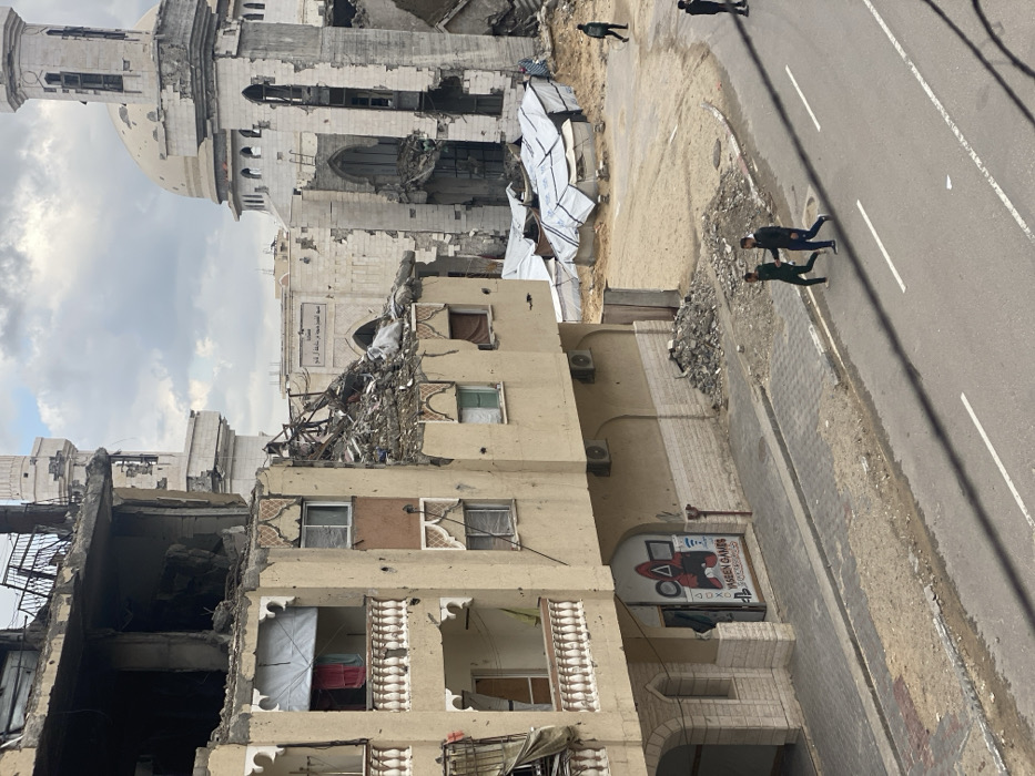 The image depicts a scene of extensive destruction in Khan Yunis, Palestinian Territory, under an overcast sky