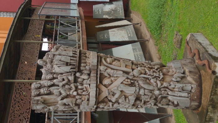 - "A large, intricately carved wooden monument dominates the foreground, depicting numerous human figures in various narrative scenes across its cylindrical surface" by FM-QrecA3, licensed under CC BY 4.0