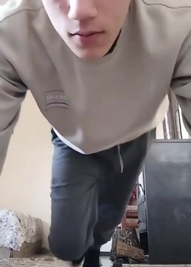 A young man is performing push-ups indoors. He is wearing a light gray sweatshirt, gray sweatpants, and black socks. He is on a patterned rug. Behind him, partially visible, are a bed and a piece of furniture. His face is visible and he is looking down at the camera. He appears to be in a residential setting.