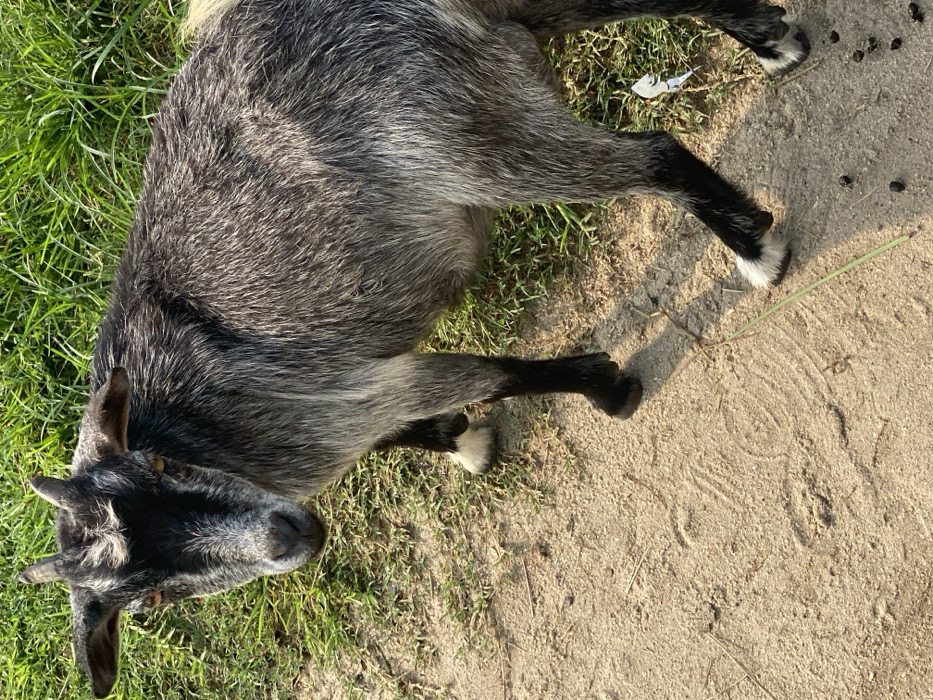 - "A single domestic goat, characterized by its predominantly grey and black fur with some white markings, is observed standing outdoors in Igbologun, Nigeria" by FM-PhEjP2, licensed under CC BY 4.0