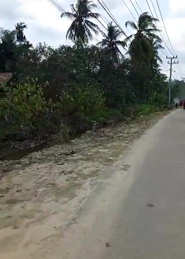 The camera travels along a grey asphalt road lined with dirt on the left side. The dirt banks next to the road morph into grassy drainage ditches. The scenery is characterized by a dense collection of green trees and tall palm trees against a cloudy, white sky. Electrical wires stretch across the sky above the road. In the distance, a person in a red shirt walks alongside a child along the edge of the road, passing a motorcyclist traveling in the same direction. Utility poles with streetlights are visible along the roadside.