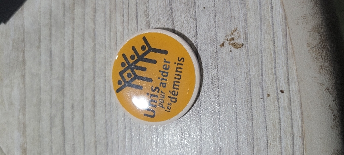 A circular yellow button pin, approximately 4.5 cm in diameter, is centrally positioned on a light grey textured surface exhibiting a horizontal wood grain pattern. The pin's face features black text in French, reading "Unis pour aider les démunis," and a graphic of five stylized black human figures, depicted with raised arms, interconnected at the shoulders, and arranged diagonally across the upper right quadrant. A prominent circular light reflection is visible on the upper left surface of the pin. Several small, dark brown granular specks are scattered on the surrounding surface, predominantly to the right of the pin. The scene is located in Dkhissa, Morocco.