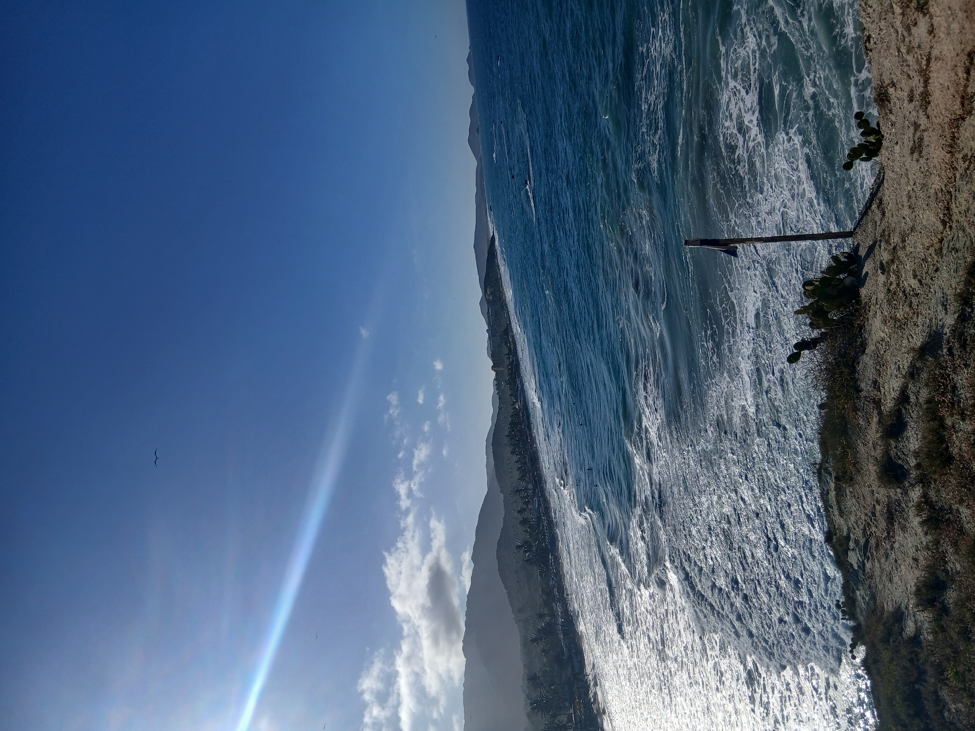 The image depicts a coastal scene in Playa Parguito, Venezuela. A turbulent, white-capped ocean stretches along the right side of the image, bordering a coarse, sandy beach. A weathered wooden post lies on the shoreline. On the beach, there are some cacti-like succulent plants. Moving inland, the beach transitions into a densely vegetated area. In the distance, hazy mountains and a coastline are visible. The sky occupies the left portion of the image. It is a vibrant blue with a few scattered clouds. A prominent sun flare appears on the lower left. There are some birds in the sky.