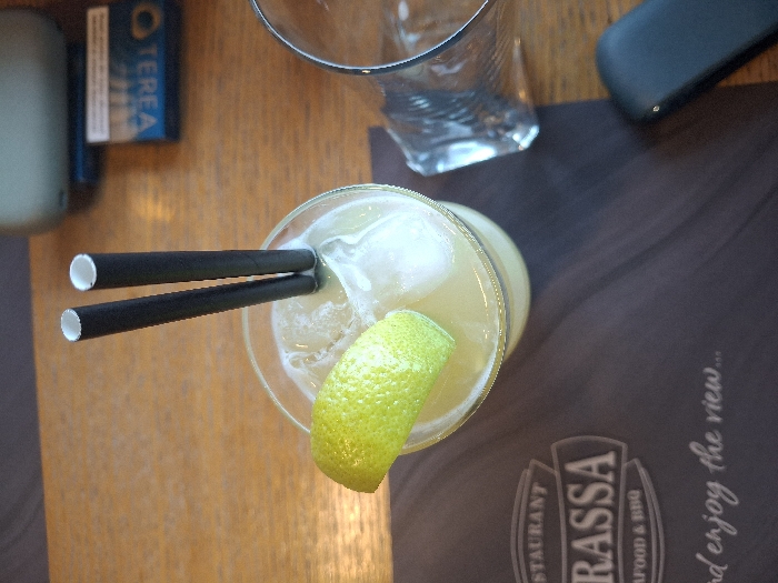 The image displays an overhead view of a table setting at Restaurant Terrassa in Ruse, Bulgaria. The surface is a light brown wooden table with visible grain. A clear glass tumbler, centrally positioned, contains a pale yellow or light green liquid, multiple ice cubes, and two black straws. A bright green lime wedge rests on the rim of this glass. Below the drink, a dark brown placemat or menu item is visible, featuring the "RESTAURANT TERRASSA" logo and the partial phrase "...and enjoy the view..." in light lettering. To the right of the main drink, a clear glass with a vertical ribbed texture is partially visible. In the upper right corner, a blue and white pack of "TEREA" brand heated tobacco sticks is present next to a light-colored, rounded electronic device. A dark-colored, elongated electronic device is partially visible in the bottom right of the frame. No individuals are present in the scene.